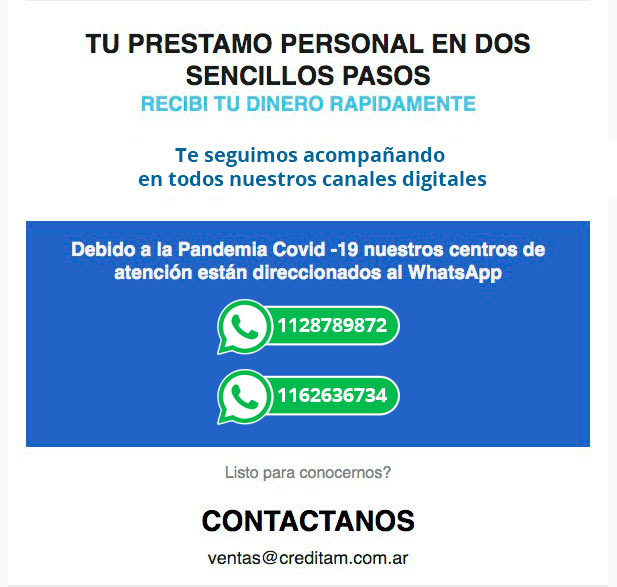El otorgamiento de Prestamo Personal esta sujeto al previo cumplimiento de requisitos comerciales y legales de Creditam Limitada. La propuesta no resulta vinculante para la entidad, quien podrá denegar la operación,conforme a la previsión del Art.974 del Codigo Civil y Comercial. Las cuotas del préstamo se debitarán automáticamente de la cuenta bancaria informada en los plazos y términos pactados. Más información en www.creditam.com.ar. Costo Financiero Total (CFT) / Tasas Anuales Equivalentes (TAE) máximas: 62.15 + IVA. Plazo mínimo de repago del préstamo es de 3 meses. Plazo máximo de repago es de 18 meses.